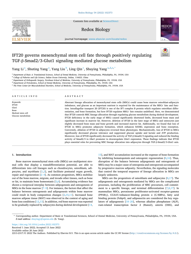 IFT20 governs mesenchymal stem cell fate through positively regulating TGF-β-Smad2/3-Glut1 signaling mediated glucose metabolism