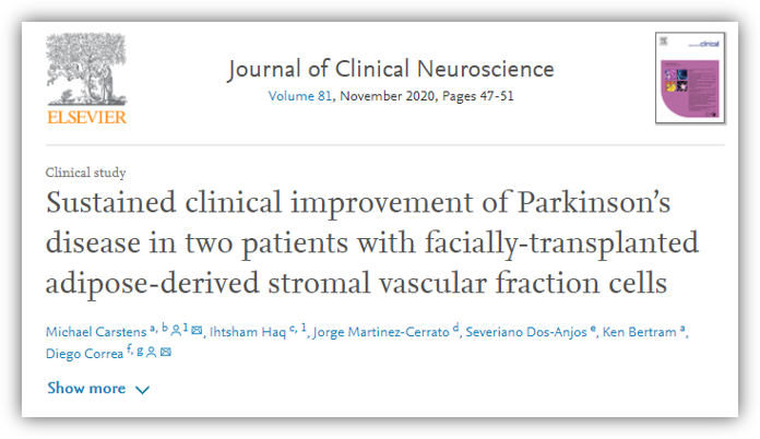 This is a case study in which researchers transplanted stem cells into the facial tissue of two Parkinson's disease patients and found sustained reductions in the patients' motor and non-motor symptoms, lower medication doses, and improved quality of life.